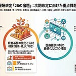 中医協第646回総会で報告されたパブリックコメント5,808件と公聴会の結果からは、5つの論点が浮かび上がりました。物価高騰・賃上げへの対応では、医療従事者の処遇改善と被保険者負担のバランスが求められています。医療DX・ICTの活用では、推進への期待とともに導入・運用面の課題解決が必要です。地域医療では、能登半島地震の教訓も踏まえた体制確保と機能分化が急務です。かかりつけ医機能の強化とオンライン診療の普及は、地域間の医療格差を解消する手段として期待されています。後発医薬品については、安定供給の確保と使用促進の両立が引き続き課題です。これらの論点は、令和8年度診療報酬改定の答申に向けた議論の核心となるものであり、今後の個別改定項目の検討に大きく影響するでしょう。