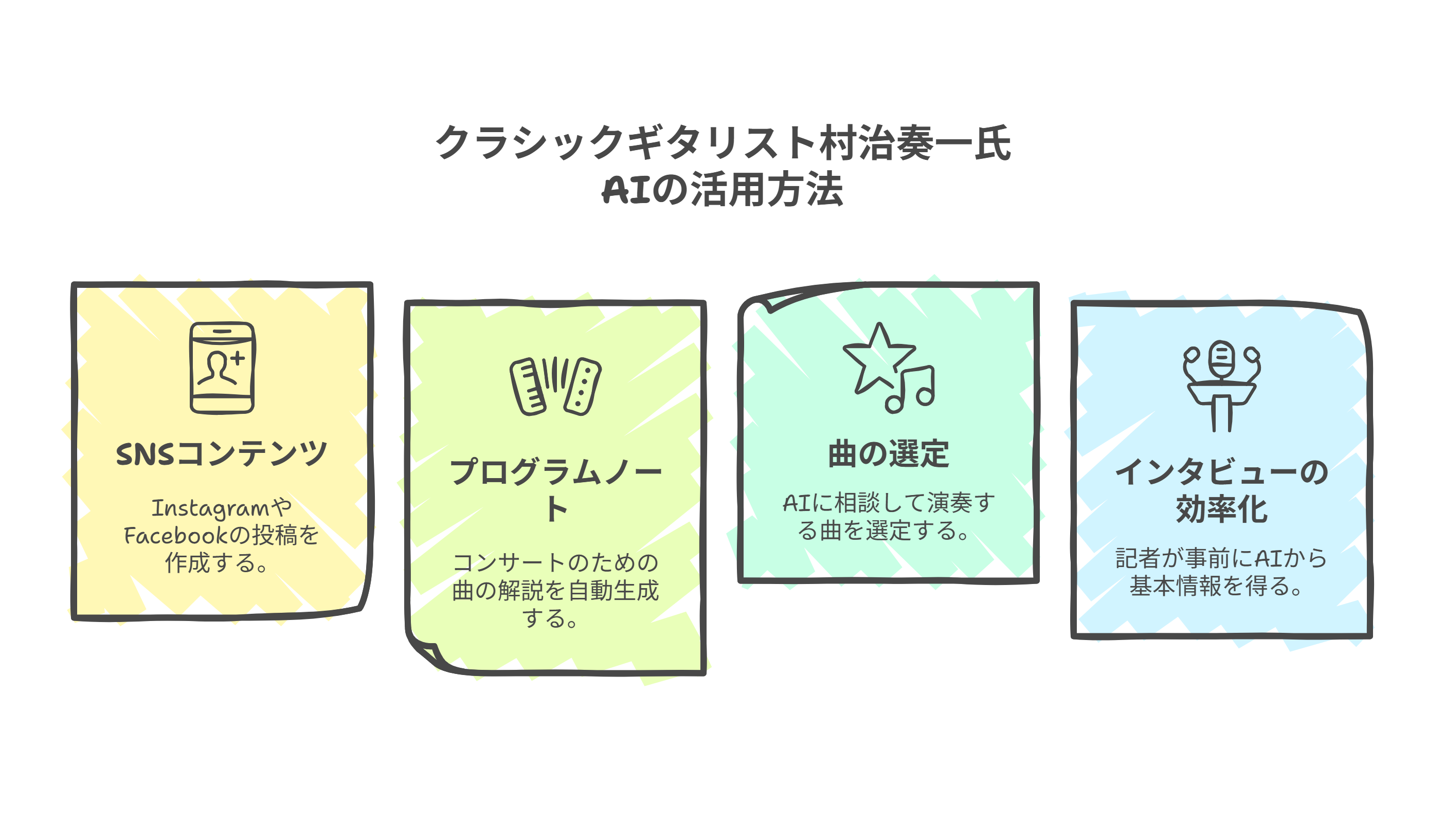 SNSコンテンツ作成から演奏曲選定まで多岐にわたる活用法は、他のアーティストやクリエイターにとっても参考になる実践例でしょう。村治氏の言葉「AIって、実はアーティストやクリエイターと本当に相性が良いので、ぜひ活用してもらいたい」は、これからの創作活動とAIの関係を考える上で重要なメッセージとなっています。