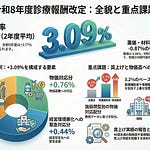令和8年度診療報酬改定における物価対応では、物価対応分+0.76%が設定されました。これに加えて、令和6年度改定以降の経営環境悪化への緊急対応分+0.44%が別途措置されます。外来診療では初・再診料とは別に物価上昇に関する評価が新設され、入院診療では入院料グループごとの物件費率に基づいて配分額が算出されます。高度医療機能を担う病院には+0.14%の特例対応が措置され、令和7年度補正予算との整合性も確保されています。経済・物価の動向が見通しから大きく変動した場合には、令和9年度予算編成において加減算を含めた調整が行われる予定です。