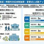 第2の見直しは、救急患者応需係数の新設です。基準該当割合に救急搬送受入件数に応じた加算を行う仕組みが導入されます。この仕組みにより、従来の「基準該当割合」は「基準患者割合に係る指数(割合指数)」に変更されます。割合指数は「従来の該当患者割合+救急患者応需係数」で算出されるため、救急搬送受入件数の多い病棟ほど割合指数が高くなります。