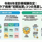 詳しくは「【令和8年度改定】ベースアップ評価料が大幅拡充|対象職員・点数・減算の3つの変更点」をご覧ください。