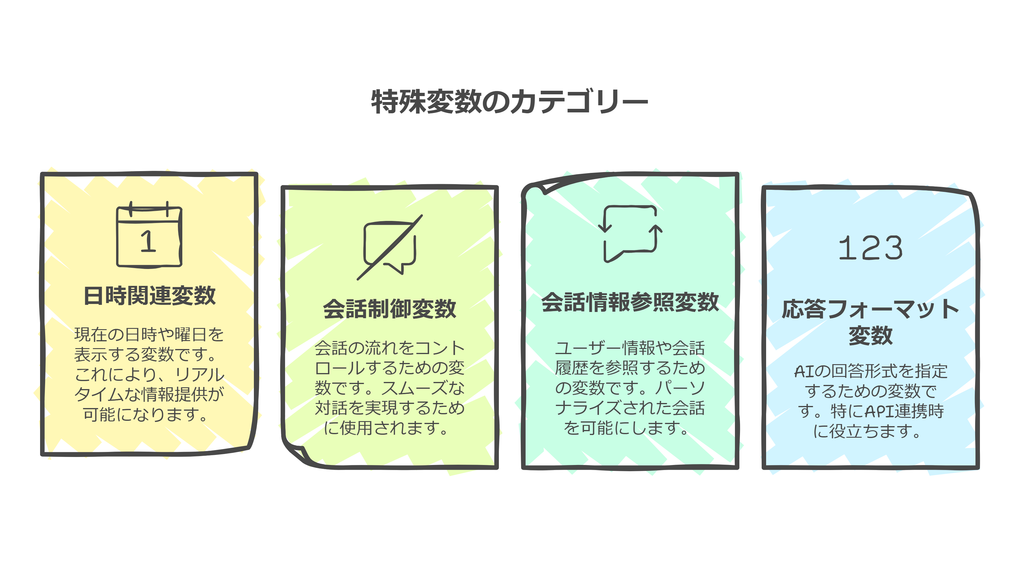 これらの特殊変数を組み合わせることで、ユーザーの状況や文脈に応じた、よりパーソナライズされた会話体験を提供できます。まずは単純な日時表示から始めて、徐々に複雑な会話制御にチャレンジしてみてください。